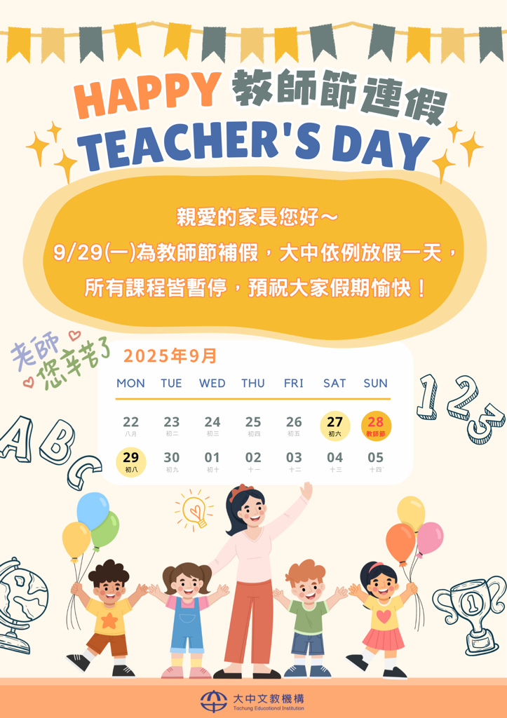 親愛的家長您好~9/29(一)為教師節補假,大中依例放假,當天所有課程皆暫停哦!預祝大家假期愉快😊😊😊✨謝謝老師們每天用愛與耐心,陪伴孩子們成長!💖㊗️辛苦的老師們,教師節快樂🎉🔸國中部9/27(六)還是要上課‼️#教師節請給老師滿滿的微笑#寶貝們記得跟老師說一聲教師節快樂😁#大中文教機構:中市南區正義街259號☎️04-22852258
