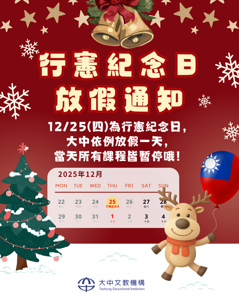 ㊗️大家假期愉快❤️#是行憲紀念日也是聖誕節#鬧鐘記得要關掉才不會被吵醒🤣#大中文教機構:中市南區正義街259號☎️04-22852258